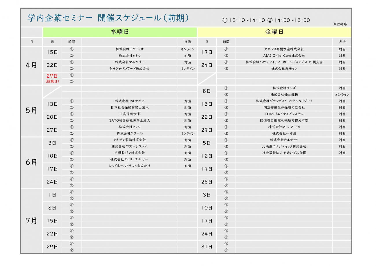 学内企業セミナー 開催スケジュール(前期)