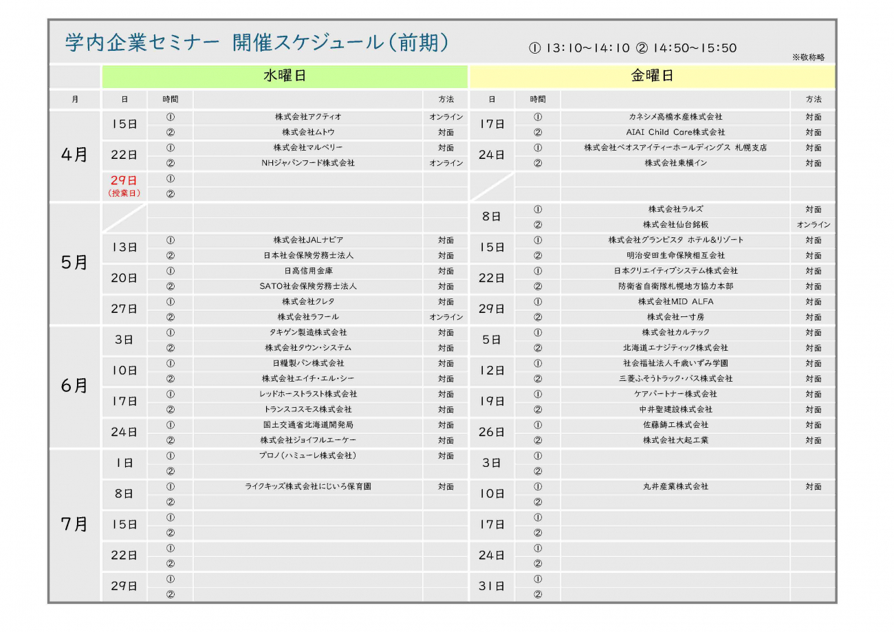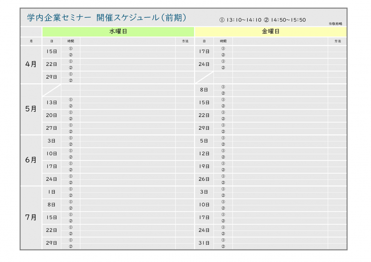 学内企業セミナー 開催スケジュール(前期)