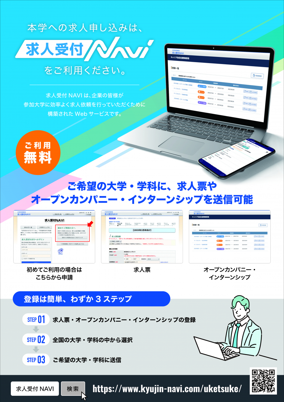 企業等の皆様が参加大学に効率よく求人依頼を行っていただくために構築されたWebサービスです。ご利用は無料です。
