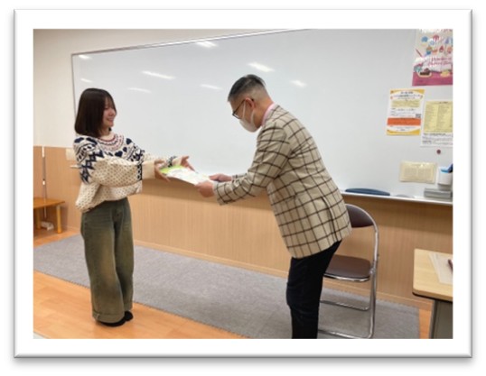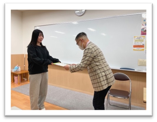認定証授与式では、講座責任者の菊地学科長より「講座にて培った絵本の“知識”、“技能”、“感性”を今後も活かしていってほしい。」とのメッセージを述べられ、1名ずつ認定証の授与が行われました。