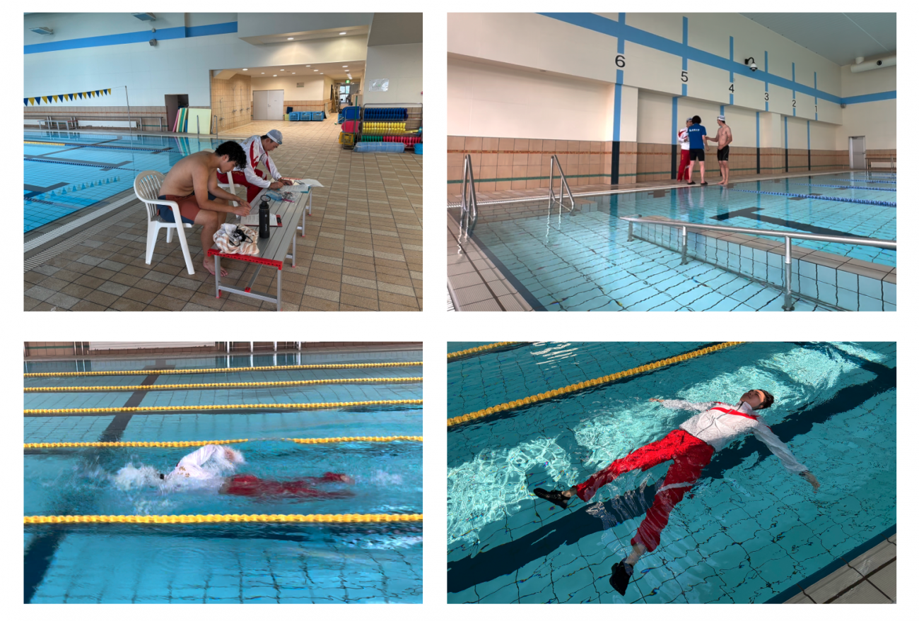 現在、本学では卒業研究の一環として、大学生・大学院生を対象に着衣泳の実験を実施しています。着衣泳と水着泳における泳タイム、主観的運動強度、疲労感などを比較し、データを収集しています。