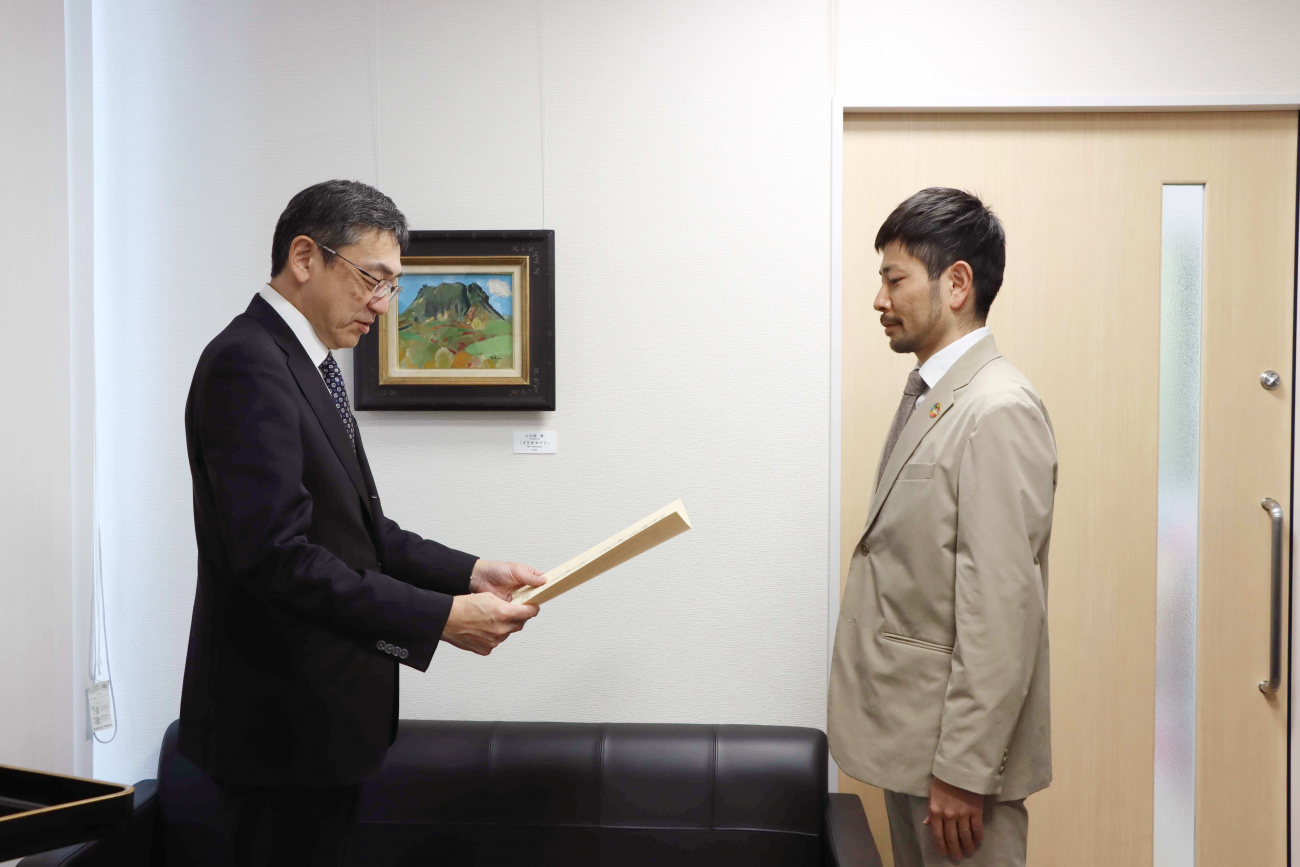 写真左より:渡邉均教育長、八鍬勇太さん、寺口由之校長 (令和6年3月 倶知安町にて撮影)