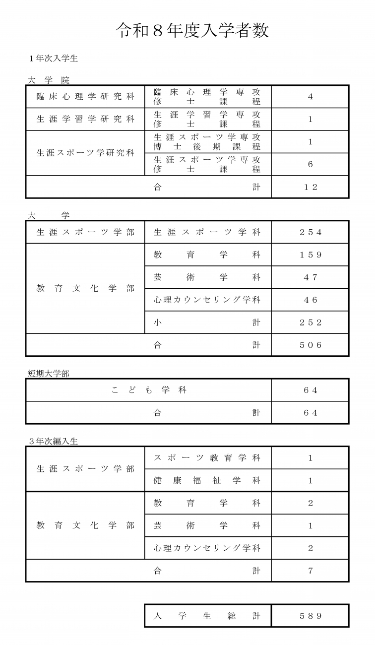 大学院入学生 12名、生涯スポーツ学部入学生 254名、教育文化学部入学生 252名、短期大学部こども学科入学生 64名、編入学生 7名、合計 589名の新入学生・編入学生を迎えました。
