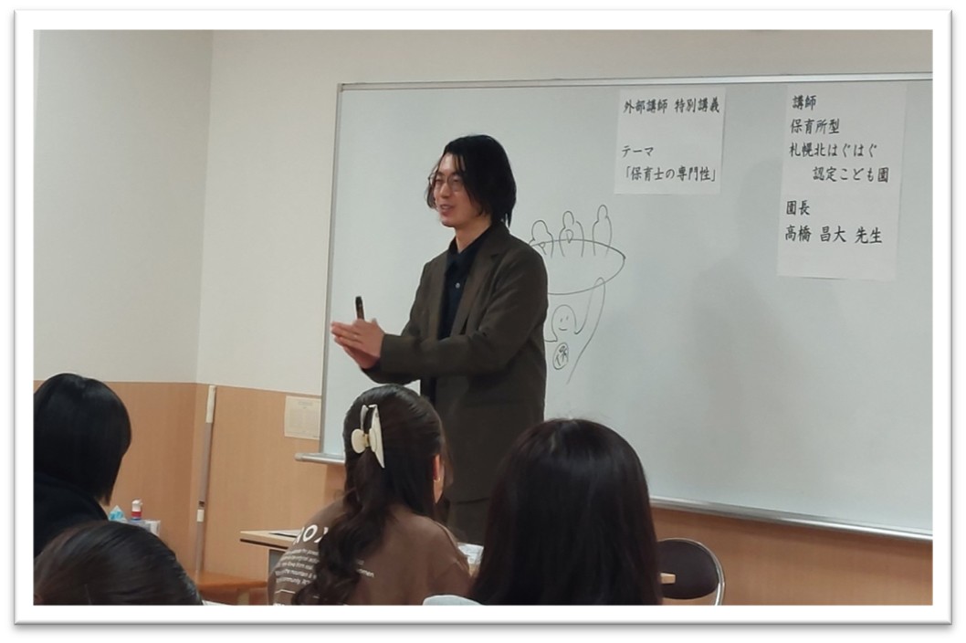 10月30日(木)「保育所実習指導ⅡB」の講義で、保育所型札幌北はぐはぐ認定こども園の園長 高橋昌大先生(こども学科卒業生)にお越しいただきました。保育所実習を終了した受講生に対し「保育者の専門性について」をテーマに特別講義を実施しました。