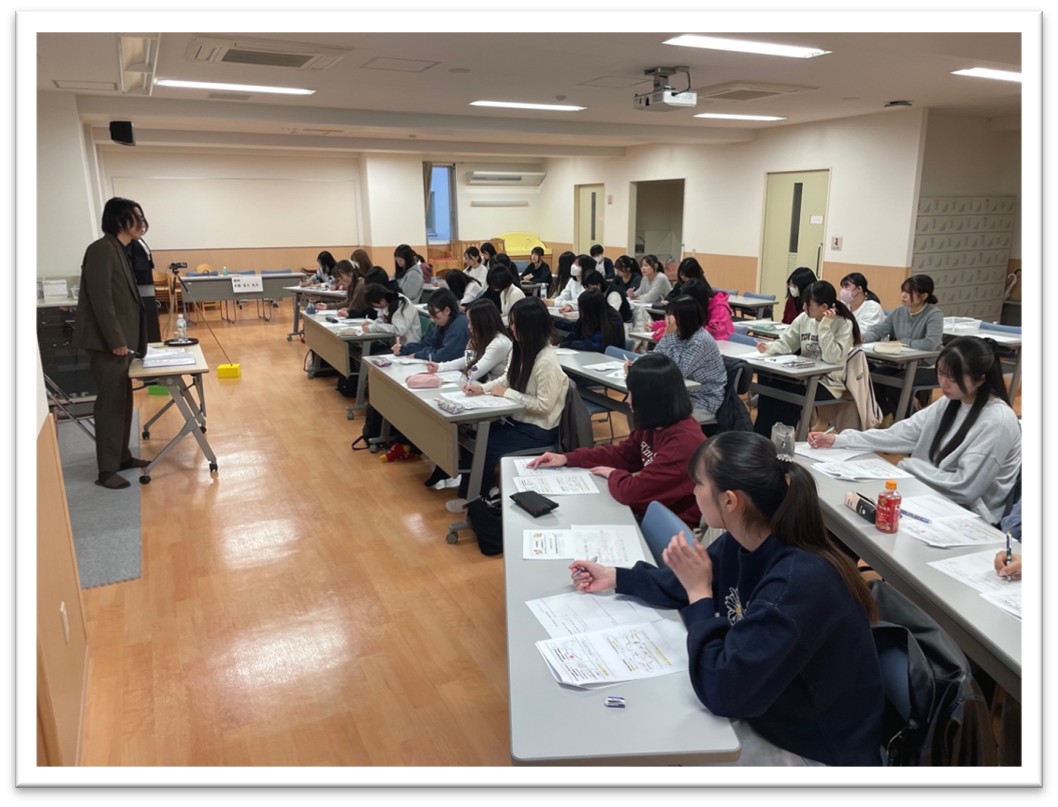子ども主体の保育とはどのようなことか、認定こども園での実例を交えながら丁寧に解説いただきました。子どもの思いを受け止めることや、子どもが自ら選択できる時間を設けることの重要性について等、新たな気付きを得る貴重な機会となりました。講義終了後も学生自ら個別に質問をするなどし、各々が学びを深めていました。