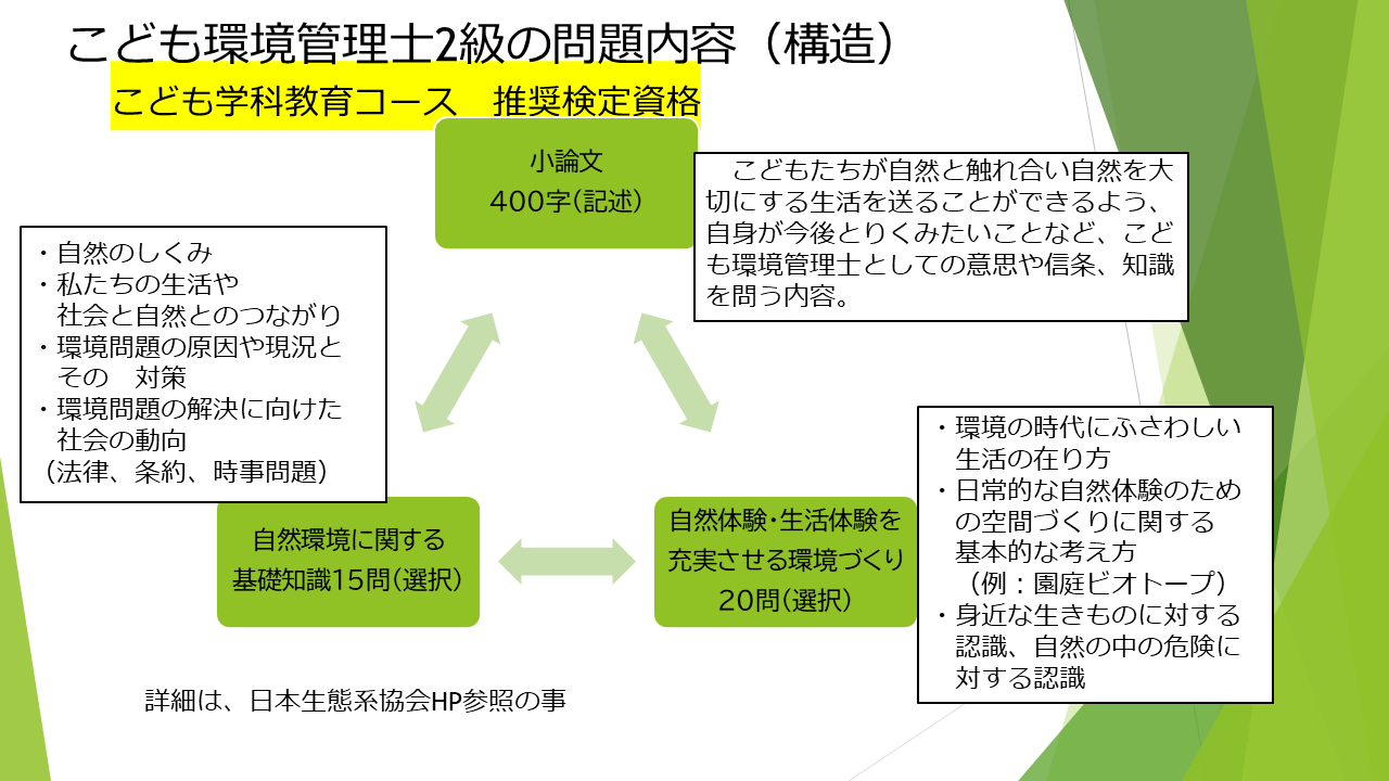 こども学科教育コース生が、「こども環境管理士2級」の検定試験に挑戦しました。こども環境管理士とは、身近な地域の保全・活用、環境問題等の解決を目指す知識・技能を有することを証明する資格です。主として、有資格者は、保育者や小学校教員としての活躍することを期待したものです。