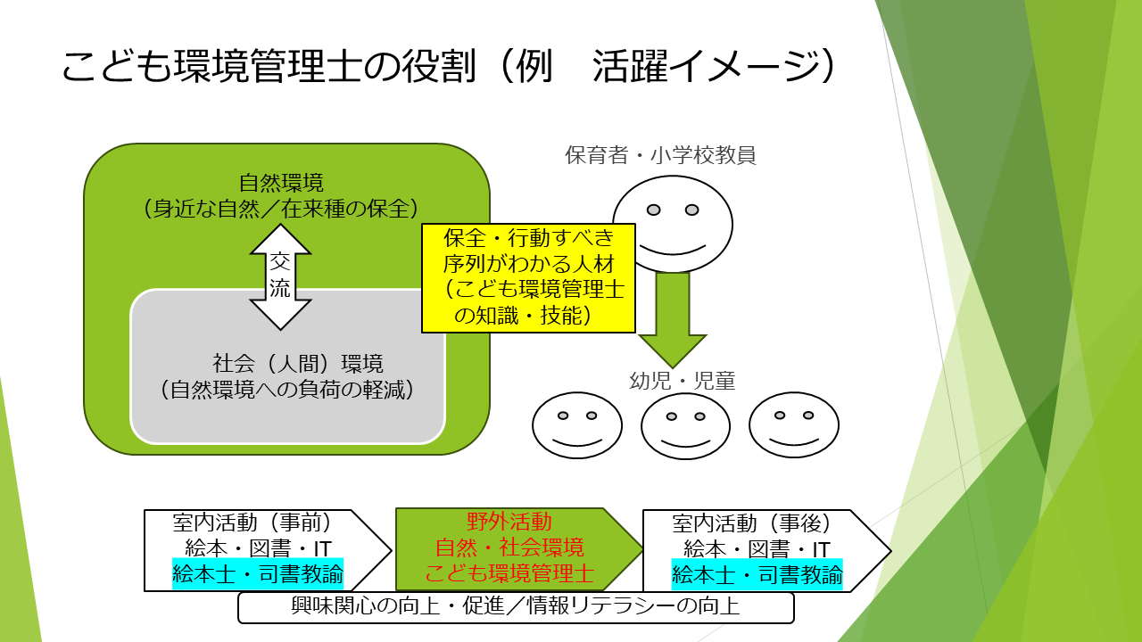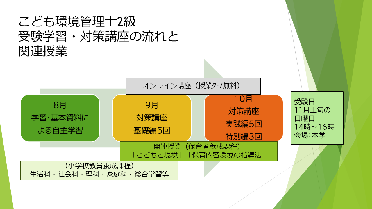 受験予定者は、検定試験に向け、基礎編5回、実践編5回、特別編3回の対策講座を受講しながら学修してきました。以下では、問題内容(構造)、対策講座の流れと関連授業、こども環境管理士の役割(活躍イメージ)を示しておきます。興味関心があれば、次年度こども学科教育コースにて、チャレンジしてみましょう。