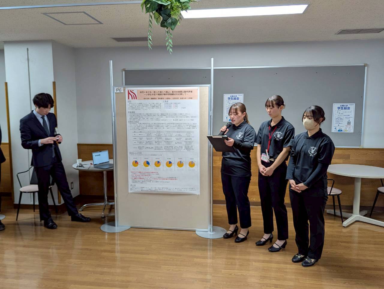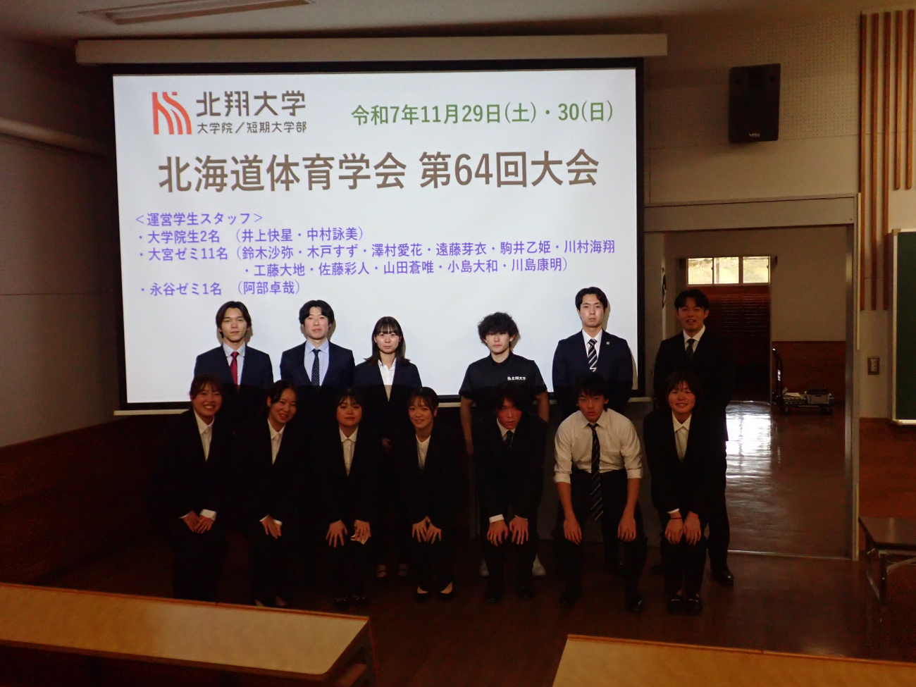 2025年11月29日(土)~30日(日)に本学で北海道体育学会大会第64回が開催され,シンポジウム「体育という言葉をめぐる社会の変化と学会の役割」がテーマでした.研究発表では,大学院生涯スポーツ学研究科修士課程1名,生涯スポーツ学部スポーツ教育学会4年生3名,3年生2名が登壇しました.今大会では道内外の研究者100名の参加者があり,本学の院生・学部生の運営業務,また研究発表をはじめとした研究者や大学院生との交流が活発に行われました.学部生の中には初めて学会に参加し,スポーツ科学の研究により興味が湧いたという学生の声がありました.次年度は,本学主催の日本体育・スポーツ・健康学会大会が開催されます.全国からの研究者が3000名ほど本学を訪れることが予想されております.より一層活発なスポーツ科学の祭典となるよう,本学教員・学生が積極的に研究発表,運営準備をして参ります.皆様,奮ってご参加いただきますよう,よろしくお願い申し上げます.