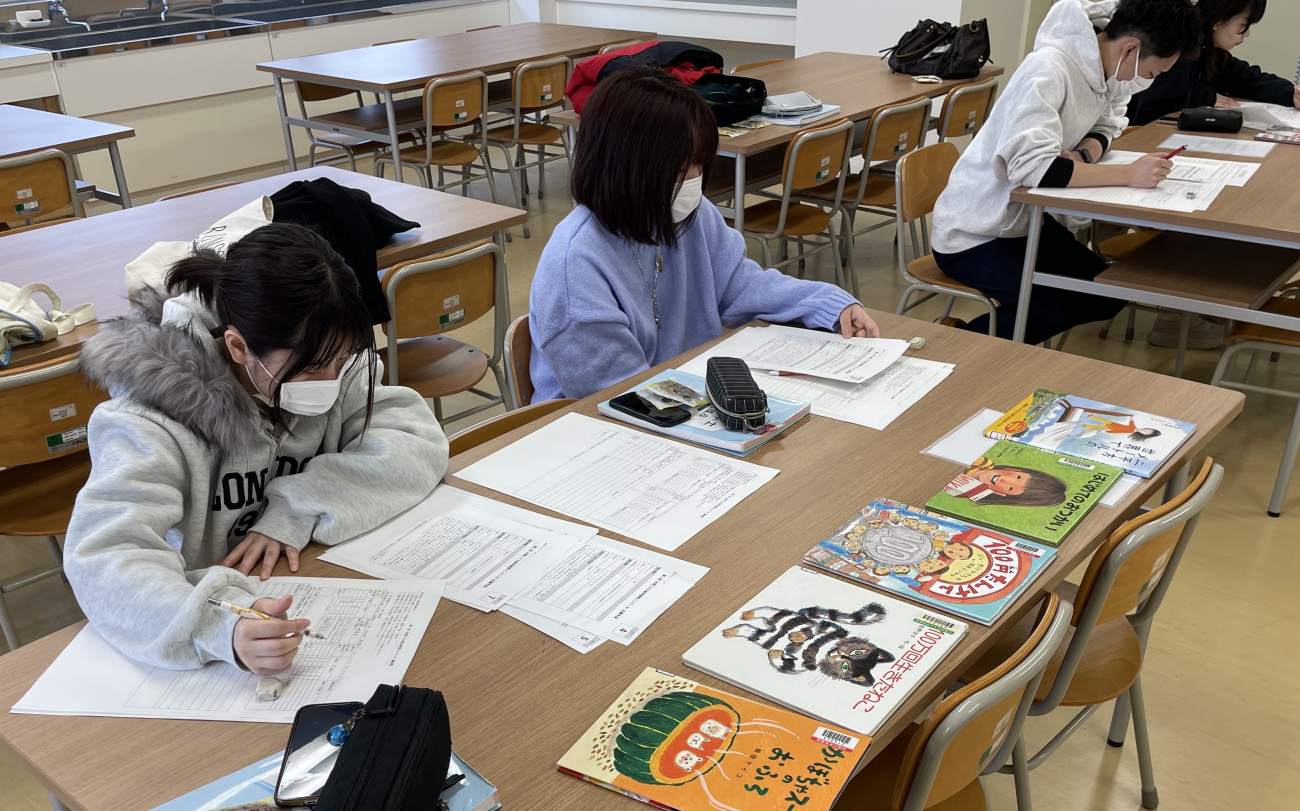 こども学科1学年の認定絵本士が、「第1回絵本感想コンクール」の応募作品について審査(6日)を行いました。認定絵本士とは、選択力(子どもの発達段階に応じた絵本を選択する力)、コーディネート力(個人やグループをネットワーク化する(むすびつける)力)、企画力(絵本に関わる事業を企画、実施する力)、コミュニケーション力(相手との適切な意思疎通ができる力)、表現力(物事を論理的に相手にわかりやすく説明する力、感情の共有化、共感する力)、指導力(研修会等の講師として指導する力、個人やグループに対しアドバイスできる力、ワークショップを運営する力)の6つ資質・能力を学び、絵本に関する専門知識・技能・感性を得たものです。