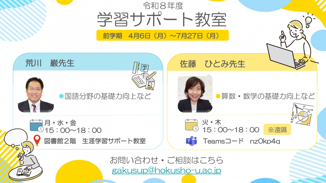 全学生対象の学習サポート教室を開講しています。 大学の学習で不安を感じていること、レポート作成や小論文対策、基礎的な数学分野、試験対策など、 幅広い学習の悩みや質問に専門の担当教員が応じます。ぜひ気軽に参加してください。 詳しくは学習支援オフィスにお尋ねください。
